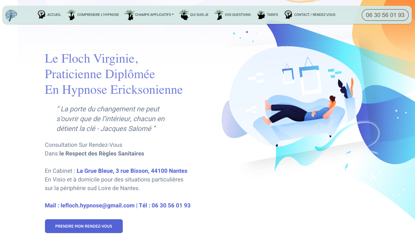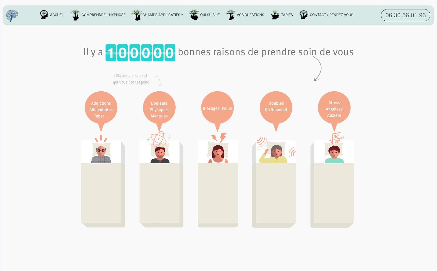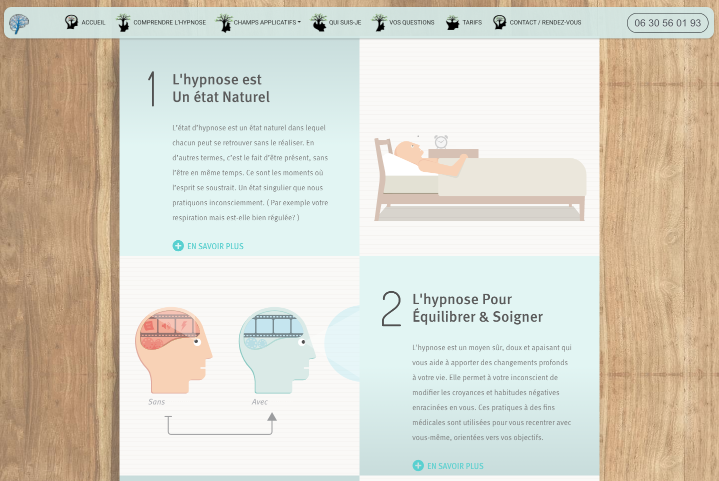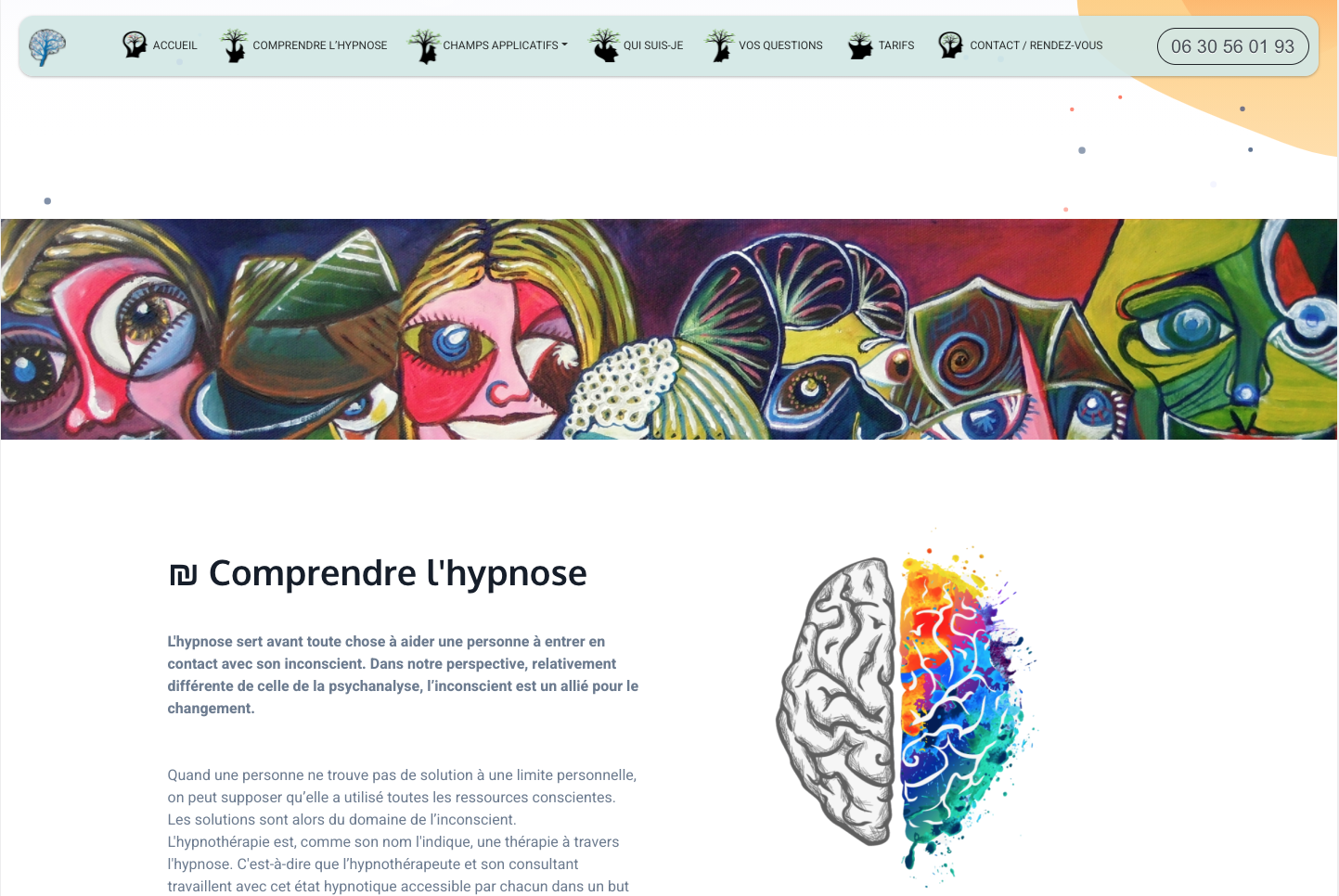 Création de plusieurs pages pour parler des champs d'applications, des fondamentaux à savoir. Image de marque conçue autour d'un style minimaliste. Formulaire de contact, chat en ligne et prise de rendez-vous à la DoctoLib pour inviter les clients à contacter l'hypnoterapeute.