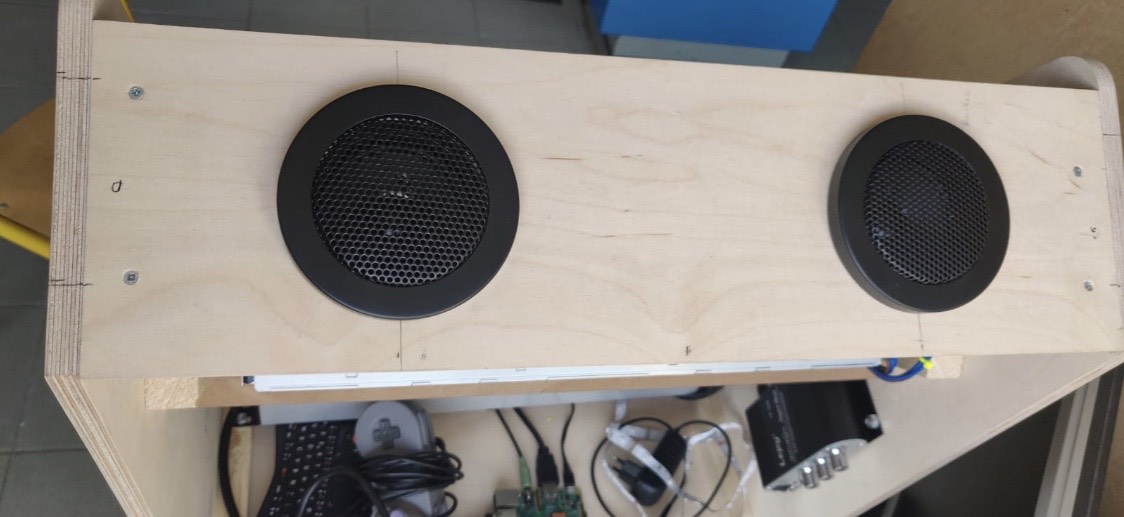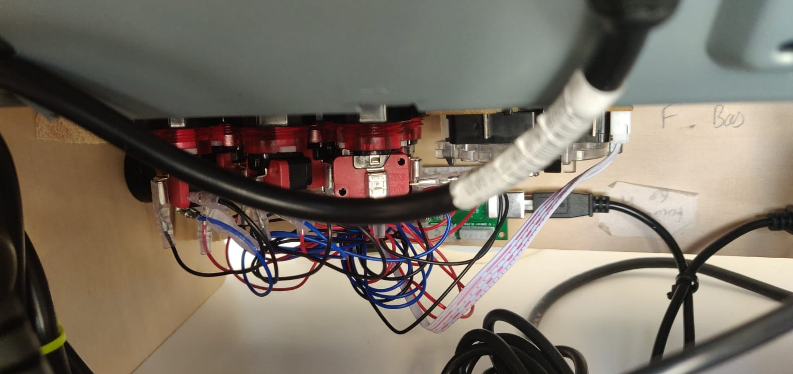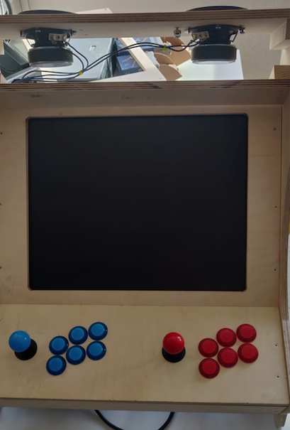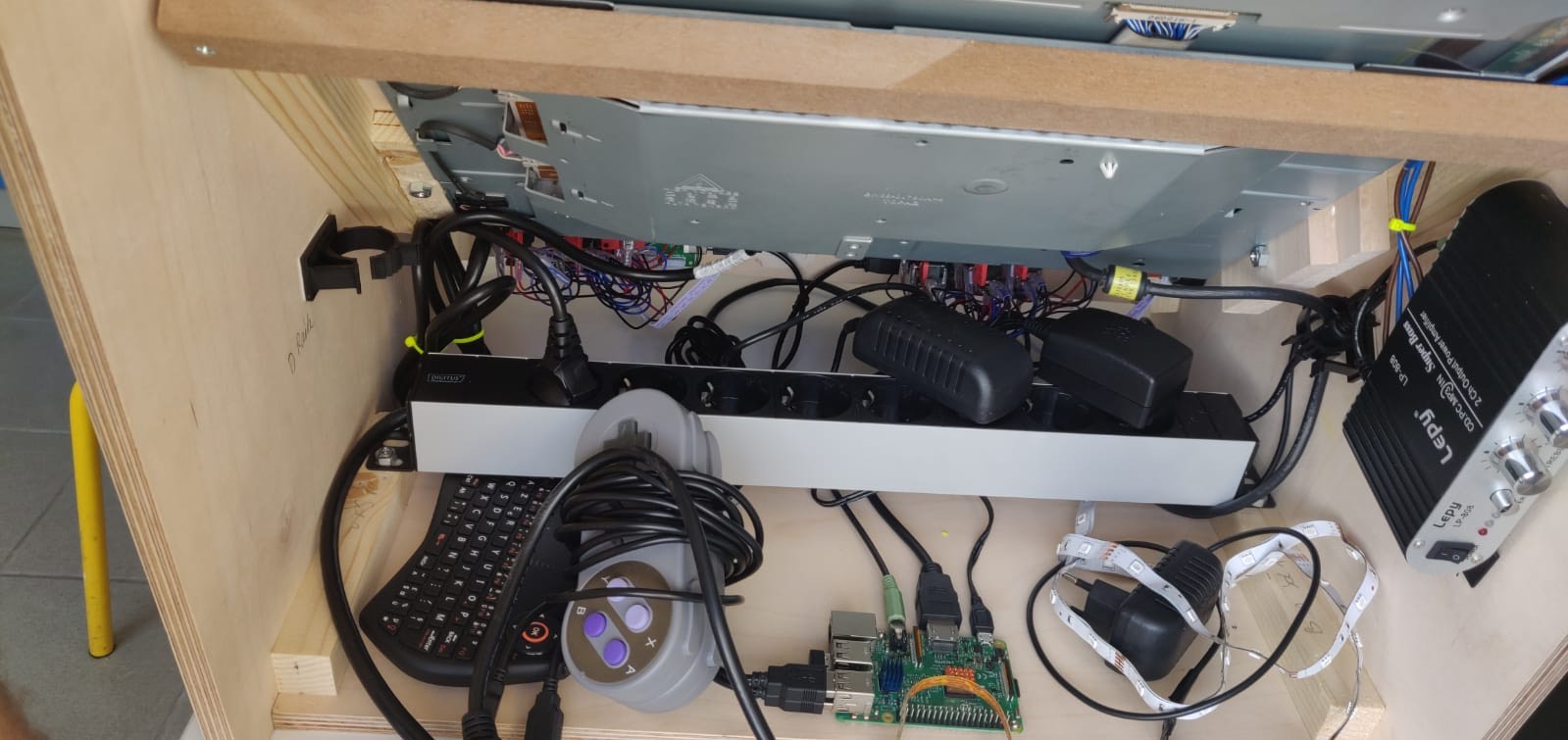 Boot USB sur le Raspberry avec les images des différents jeux. Construction du châssis avec écran 19" + enceinte intégrée. Programmation des boutons d'action.